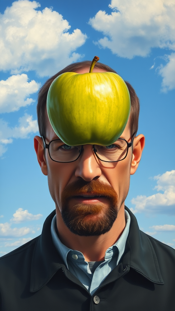 A striking oil painting portrait of Bryan Cranston as Heisenberg from Breaking Bad, depicted in hyper-realistic detail, stands directly facing the viewer. A vibrant, ripe green apple levitates just in front of his face, partially obscuring it, while his intense gaze pierces through. Behind him, an endless expanse of serene blue sky dotted with fluffy, cotton-like clouds creates a surreal backdrop. The painting, inspired by René Magritte's "The Son of Man," includes subtle differences—a slight tilt to the apple, a softer light casting intricate shadows across his features, and wisps of smoke curling upward from a lit cigarette in his hand, adding an enigmatic aura to the scene.