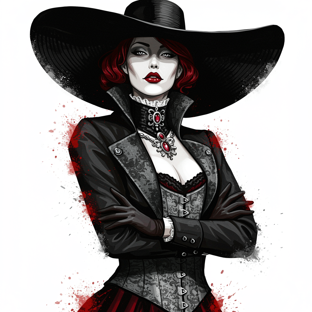 A striking painting of a woman adorned in a wide-brimmed black hat, the scene is infused with a bold color splash technique highlighting dark silver and deep red accents. Her attire exudes a steampunk flair with intricate metallic embellishments. The composition features a figura serpentinata pose that conveys elegant movement, with contrasting values of crisp white and vibrant red creating a captivating visual harmony. Set against a pristine white background, the woman's handsome yet enigmatic visage commands attention, inviting the viewer into a world where elegance and mystery intertwine.