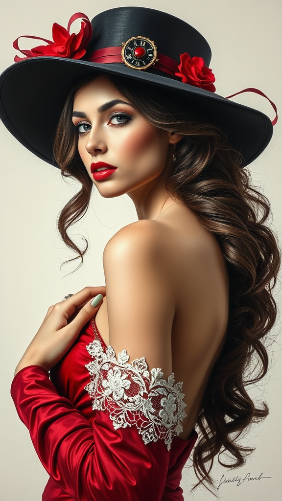 A striking painting portrays a woman donning an elegant black hat, enveloped in metallic dark silver and vibrant red hues, embodying a steampunk essence. Her figure twists gracefully in a figura serpentinata pose, seamlessly blending handsome poise with contrasting values. Dominant whites and reds accentuate her form against a pristine white background, inviting the eye to explore the depth and play of colors. Subtle touches of intricate gear motifs and delicate lace add a unique flair, enhancing the fusion of classical elegance with industrial mystique.