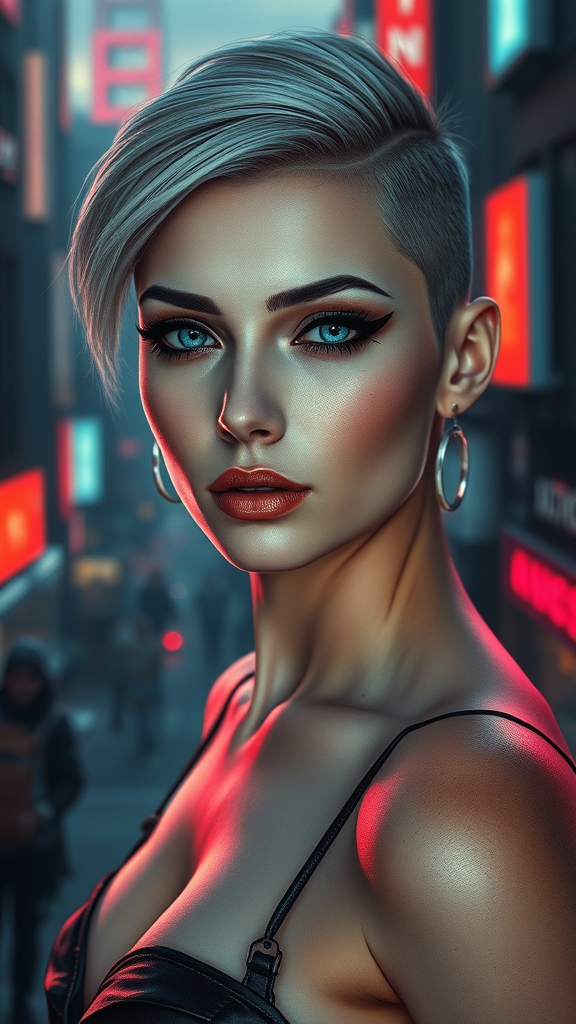 A striking pale cyberpunk woman with intense black eyeliner and captivating blue eyes, featuring a shaved side haircut, depicted in hyper detail with cinematic lighting. She stands amidst a cityscape painted with magical neon hues, embodying a dark allure. The city's atmosphere is tinged with mystery and intrigue. Her expression holds a story, as errors in the visual transition create a surreal blend of art and digital disturbance. Her form is slightly abstract, hinting at missing or extra elements, alluding to a futuristic world where beauty and imperfection coexist. The setting carries a sense of low resolution, with subtle jpeg artifacts and hints of a narrative beyond visual accuracy, merging the lines between reality and cyber imagination.