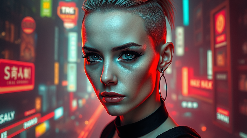A striking pale cyberpunk woman with intense blue eyes and a side-shaved haircut, adorned in heavy black eyeliner, surrounded by hyper-detailed, cinematic lighting. She stands against the backdrop of a dark red city illuminated by enchanting neon hues, creating an atmosphere of otherworldly allure. Her presence is both mystical and powerful, harmonizing with the intricate urban landscape.