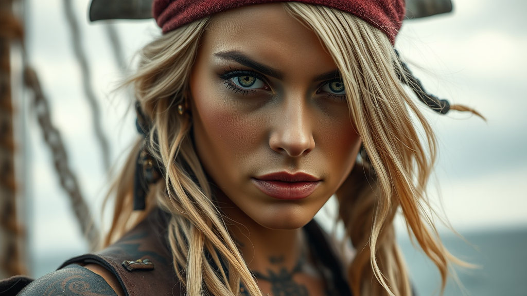 A striking photo portrait of a stunning blonde female pirate with an intense gaze, showcasing detailed skin and hyperrealistic features. Captured in full-length with a dynamic pose that exudes confidence, her expressive facial features and intricate tattoos tell a captivating story. The scene is enhanced with high detail RAW color art, complemented by subtle piercings. Soft diffused lighting envelops her, enhancing the shallow depth of field and ensuring a sharp focus. The image boasts cinematic lighting, with added elements of sea spray on her weathered attire and a hint of wind in her hair, evoking the adventurous spirit of the high seas, all set against a slightly overcast sky.
