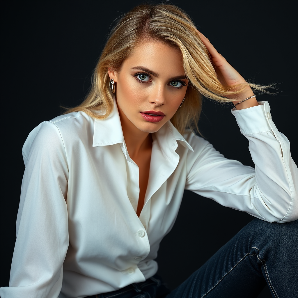A striking photo shoot of a blonde woman with captivating green eyes, styled in an elegant white blouse and trendy dark-wash denim, set against a bold charcoal backdrop. Her sleek look is enhanced with subtle silver jewelry, and soft lighting casts intriguing shadows that accentuate her confident pose and the rich textures of the fabric.