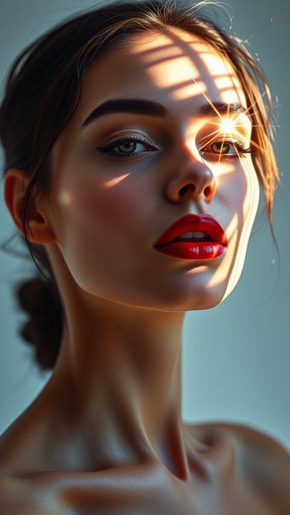 A striking photograph captures a female model against a pristine white backdrop, with ethereal light flares dancing across her features, creating a sense of mystique and invisibility, painted in vivid, surreal tones, blending a high-fashion aura with an enigmatic, modern twist.