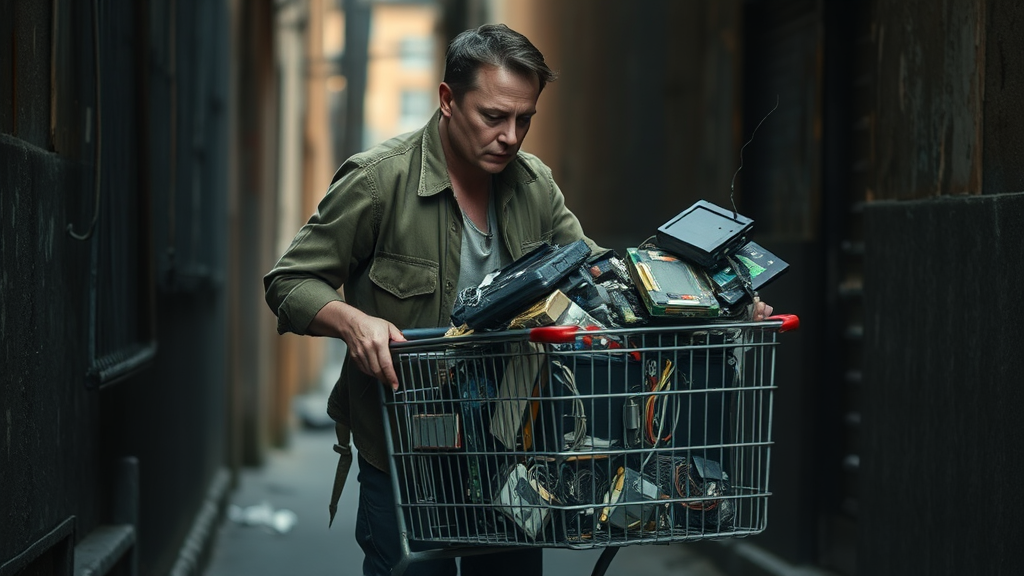 A striking photograph captures a revealing moment of renowned tech mogul Elon Musk, clad in tattered clothing, maneuvering a battered shopping cart through the shadows of a dim alleyway. The cart, once an icon of consumer convenience, now carries a heap of discarded electronic components, strewn with circuit boards and old lithium batteries, bound for a nearby recycling depot. Despite his status as a billionaire and transformative visionary, Musk seems to inhabit the life of an unnoticed wanderer, seamlessly merging into the gritty urban landscape, subsisting on the disposal of obsolete technology. Bathed in raw, natural light that accentuates the scene's rough edges, the image possesses an unpolished, documentary feel, with a softly blurred background amplifying its authenticity. The focus is on Musk's posture—his shoulders slightly hunched and gaze lowered—evoking a narrative of contemplation and quiet perseverance. This evocative image delivers a potent juxtaposition between Musk's perceived global influence and his intimate role within the cycle of urban survival, prompting reflection on the complexities of technological advancement and the unseen lives of those who quietly endure societal edges.