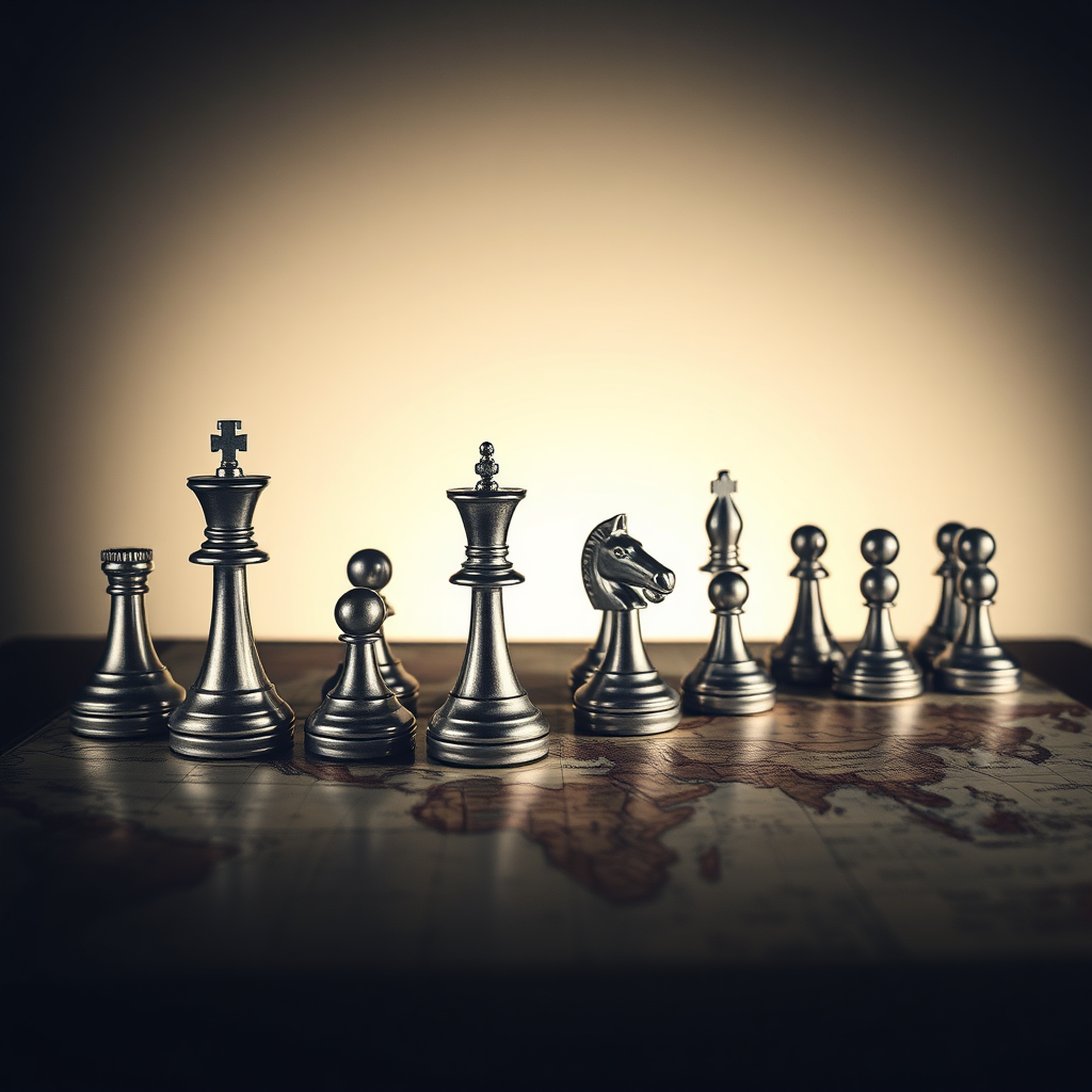 A striking photograph capturing exquisitely detailed platinum chess pieces arranged on a board crafted from vintage nautical maps, symbolizing global influence, strategic foresight, and intellectual prowess. The pieces cast dramatic, artful shadows and subtle highlights, creating a sense of depth, set against a sleek, dark-steel background that transitions smoothly to a gentle, creamy ivory towards the horizon. This evokes a sense of refined luxury and sophistication. The maps' aged, rustic tones contrast beautifully with the chess pieces' metallic luster, while the overall composition radiates elegance, precision, and high-stakes strategic engagement.