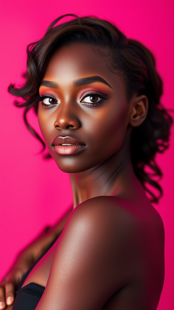 A striking photograph features a black woman model against a vibrant hot pink backdrop. The image captures her stylish and intricately detailed eyes, utilizing a camera setup that emulates the effect of a large aperture, around f/1.4, to achieve a dreamy depth of field. The composition is portrait-oriented with an aspect ratio of 9:16, showcasing a raw and authentic style that highlights her natural beauty and charisma. Her pose is confident and poised, embodying elegance and sophistication against the monochromatic pink setting.