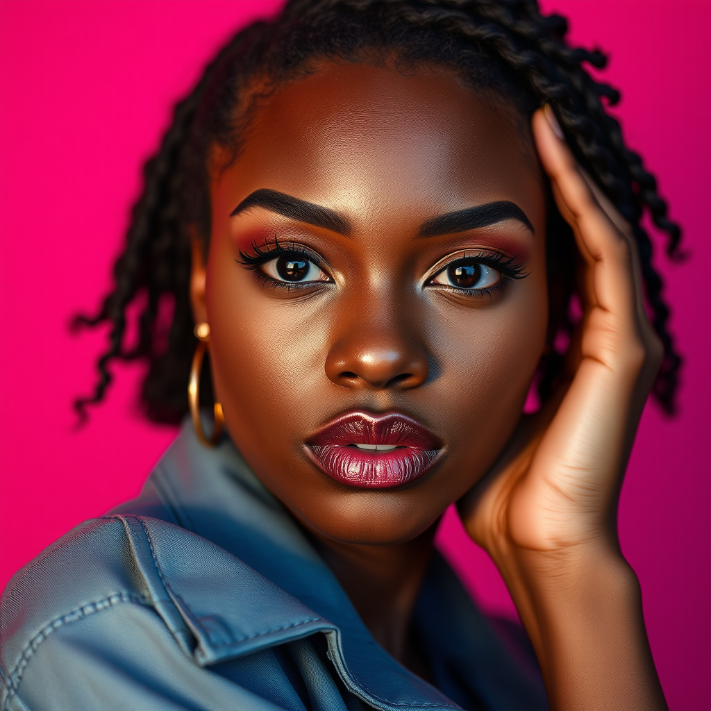 A striking photograph of a Black woman model posed against a vibrant hot pink backdrop, showcasing her stylishly detailed eyes. The image is captured with a camera setup that simulates the dreamy depth of field of a wide aperture, f/1.4. The model exudes confidence, with lighting that accentuates her features and creates a captivating visual experience. The composition maintains a raw and authentic style, drawing the viewer's focus to her expression and the seamless blend of colors in the background.