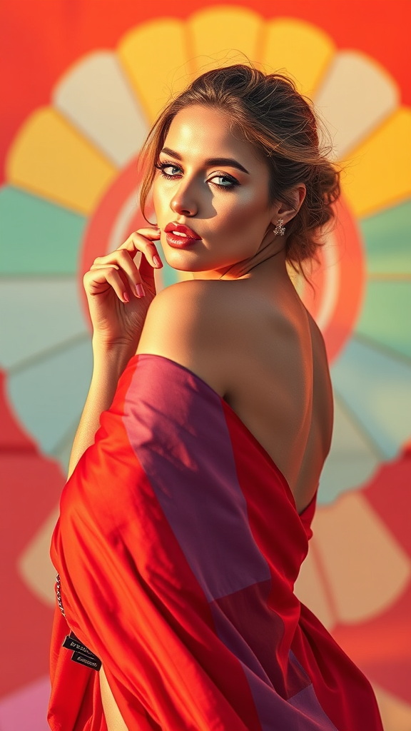 A striking photograph of an elegant Instagram fashion model in a vibrant red wrap, posed with flair, infused with colorful geometric patterns. Inspired by the dynamic style of Guy Aroch and the immersive visuals of Unreal Engine 5, reminiscent of Helene Knoop's artistry. Embellished with glowing pastels, defined by bold lines and radiant hues, capturing the essence of sun-soaked colors. Shot with the precision of a Fujifilm X-T4 and the clarity of a Sony FE 85mm lens, the composition is set within an aspect ratio of 900:1600. The raw, vivid style emphasizes the vibrant energy and artistic flair.