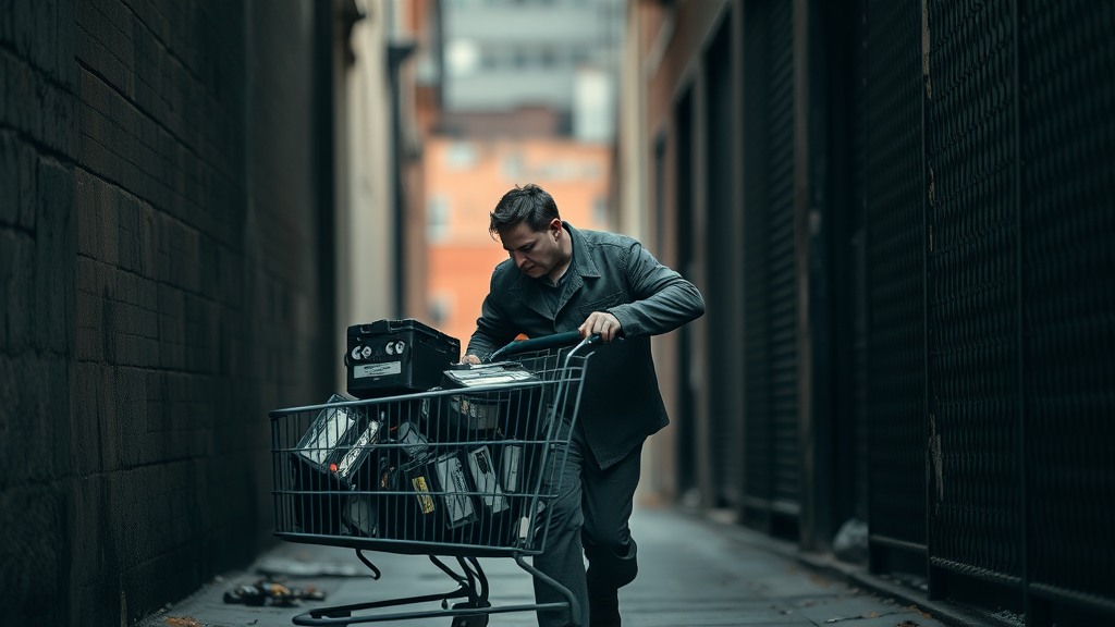 A striking photograph reveals a poignant scene of tech magnate Elon Musk, clad in tattered clothing, navigating a shadowy alleyway while pushing a shopping cart laden with obsolete car batteries. The juxtaposition of his disheveled appearance with the typically sleek image of the billionaire entrepreneur is both jarring and evocative. Musk, now seemingly immersed in the life of the homeless, is seen diligently hauling the batteries to a nearby recycling plant, a task that hints at a new, austere chapter in his life. Captured in raw natural light, the photograph exudes an authentic and gritty texture, with a softly blurred background enhancing the spontaneous nature of the shot. Musk's posture, head bent and eyes downcast, exudes a profound sense of resignation and introspection. This powerful image compels viewers to contemplate the harsh realities of homelessness and the relentless struggles endured by those in such dire circumstances, exquisitely detailed, Super-Resolution, UHD, DTM, HDR, 8K --ar 9:16 --q 2.