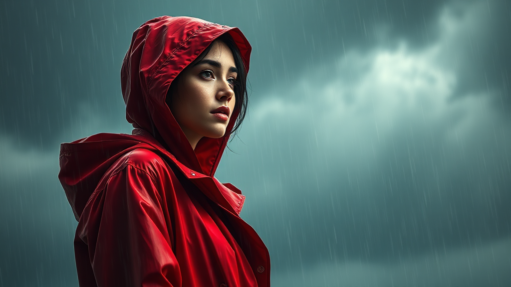 A striking photorealistic painting by Hedi Xandt, capturing a woman in a vibrant crimson raincoat standing amidst a gentle shower, reminiscent of a high-definition art photograph. This composition, worthy of CG Society and Behance spotlight, evokes a sense of tranquility and introspection. Rendered with Redshift, the scene reflects the subtle play of light on raindrops, captured with the precision of a Nikon D750. Her delicate expression contrasts with the dramatic deep gray clouds, highlighting the beauty of human connection to nature's elements.