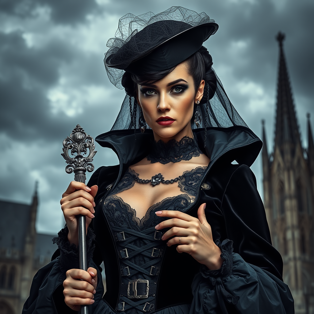 A striking portrait captures a formidable woman with an unwavering gaze, her dark eyes full of intensity. She poses confidently in a structured, Gothic-inspired gown made of sumptuous dark velvet and lace, adorned with intricate metal clasps and cascading layers of black fabric that evoke movement. The gown's sharp angles contrast with the fluidity of the fabric. Her head is crowned by a tall, pointed hat embellished with delicate veiling, and her ebony hair is pulled back into a severe, tight bun. In her hand, she holds a long, ornate silver scepter, her expression grave yet commanding. The backdrop features a turbulent, stormy sky and majestic, towering Gothic spires, amplifying the dramatic and powerful essence of the portrait.