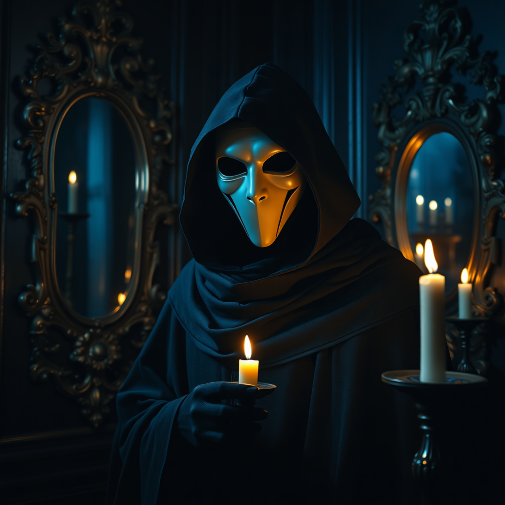A striking portrait captures a masked mystic ensconced in a darkly ornate baroque chamber, adorned in a complex, shadowy cape. The mystic's pale mask features sharp, defining lines, with a solitary candle casting dramatic, flickering shadows across the room. An opulent, gilded mirror reflects the chamber's enigmatic air. The scene is bathed in a deep blue-black palette, accentuated by cinematic chiaroscuro lighting. The setting evokes a Gothic Renaissance aesthetic, characterized by an ethereal and mysterious ambiance. The composition is hyperdetailed and photorealistic, embracing a dramatic and captivating aura.