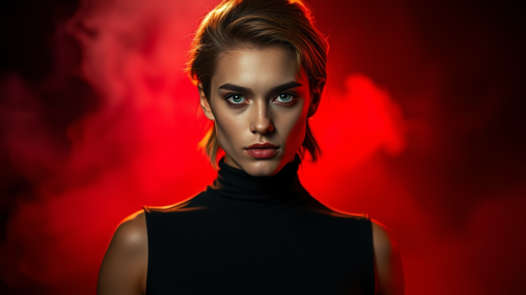A striking portrait captures a professional model set against a dynamic backdrop that elegantly transitions from pitch black to a fiery crimson. The scene is beautifully lit with a key light, accompanied by soft diffusion and a warm red gel backlight, establishing a modern and sophisticated photoshoot ambiance. The model's head is slightly tilted, eyes locked confidently into the lens, exuding a commanding presence. Dressed in a sleek high-neck top, they stand amidst a gentle mist, casting surreal and diffused shadows in the lowlight environment. Enhanced tonal adjustments subtly play with light and dark areas, while a textured grain overlay adds depth to the image. This cinematic shot focuses on the model’s chest and head, highlighting their distinctly ancient Greek facial features, enriched by the fascinating heterochromia—their eyes, one a vivid blue and the other a warm brown, offer a mesmerizing point of intrigue. Captured with precision using a red camera, the image boasts crisp details that bring the subject to life within this vividly atmospheric setting, making slight creative modifications to enhance the evocative essence.