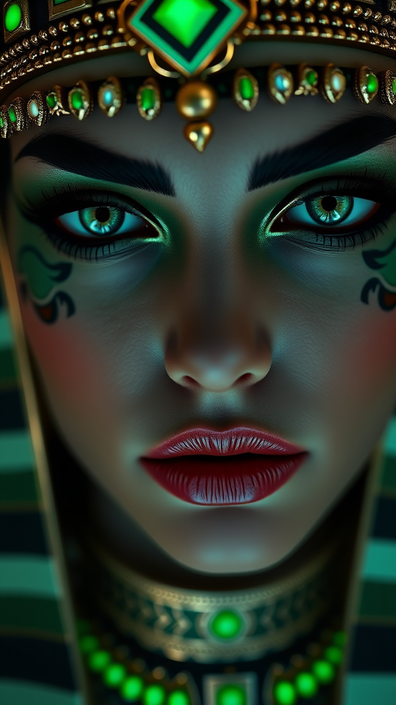 A striking portrait in mdjrny-v4 style featuring a young female face with a captivating green aesthetic. Her features are crafted with the golden ratio, creating a perfect symmetry that exudes elegance and luxury. The artwork is ultra-realistic and ornate, showcasing intricate details in a photorealistic manner. Rendered with the power of octane render and unreal engine, the image boasts an 8k resolution with sharp focus and volumetric lighting. Inspired by the masters Artgerm, Greg Rutkowski, Alphonse Mucha, and Vraska Golgari, the scene presents a close-up of the subject with exquisite makeup. Infused with elements of Egyptian art à la Christian W. Staudinger, the work draws inspiration from past Behance contest winners. The overall effect is that of a mesmerizing video art piece, reminiscent of a freakshow reimagined by industrial light and magic. The composition showcases a shallow depth of field, emphasizing the subject's face details, particularly the Egyptian makeup, all rendered with advanced CGI techniques.