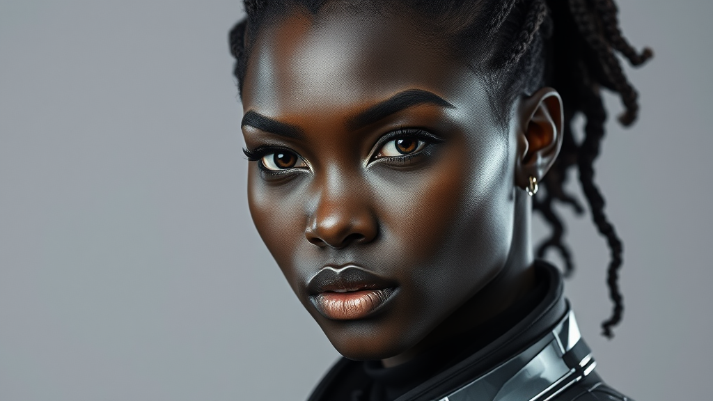 A striking portrait of a black woman in futuristic techwear, her attire featuring sleek, angular lines and metallic accents that catch the studio lighting perfectly, casting dynamic shadows and highlights. Her expression is one of fierce determination, with ultra-realistic attention to detail capturing the subtle textures of her skin and the intricate weave of her clothing. Her eyes, sharp and focused, seemingly reflect an unseen digital landscape. The studio lighting renders every detail with dramatic clarity against a smooth, neutral background, emphasizing the aesthetic balance between her modern attire and her poised demeanor.