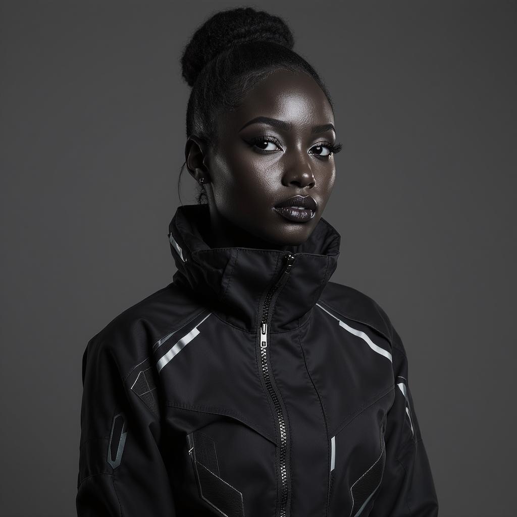 A striking portrait of a black woman in sleek techwear, her attire blending minimalist design with futuristic elements, ultra-realistic with an emphasis on intricate detailing. Her outfit features dark, water-resistant fabrics with subtle reflective accents, complementing the contours of her form. Studio lighting casts a soft glow, highlighting her features and the texture of her clothing. Her hair is styled in a modern updo, and her expression exudes confidence and intelligence. The background is kept simple to maintain focus on her presence and the innovative design of her techwear ensemble.