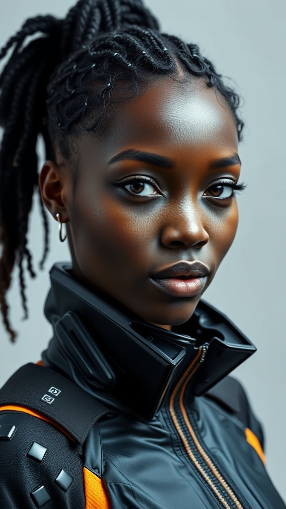 A striking portrait of a black woman in techwear, showcasing an ultra-realistic and highly detailed appearance. The image captures her in a studio setting with perfect lighting that highlights the intricate textures and sleek design of her futuristic outfit. Her expression is confident and poised, embodying a sense of empowerment and innovation. The backdrop is minimalistic, subtly emphasizing the modern and cutting-edge theme. Vibrant yet sophisticated, her attire combines functionality with style, featuring advanced materials and streamlined silhouettes. The overall composition achieves a captivating balance, exuding both strength and elegance, with subtle creative touches to emphasize her unique presence in a world of technology and fashion.
