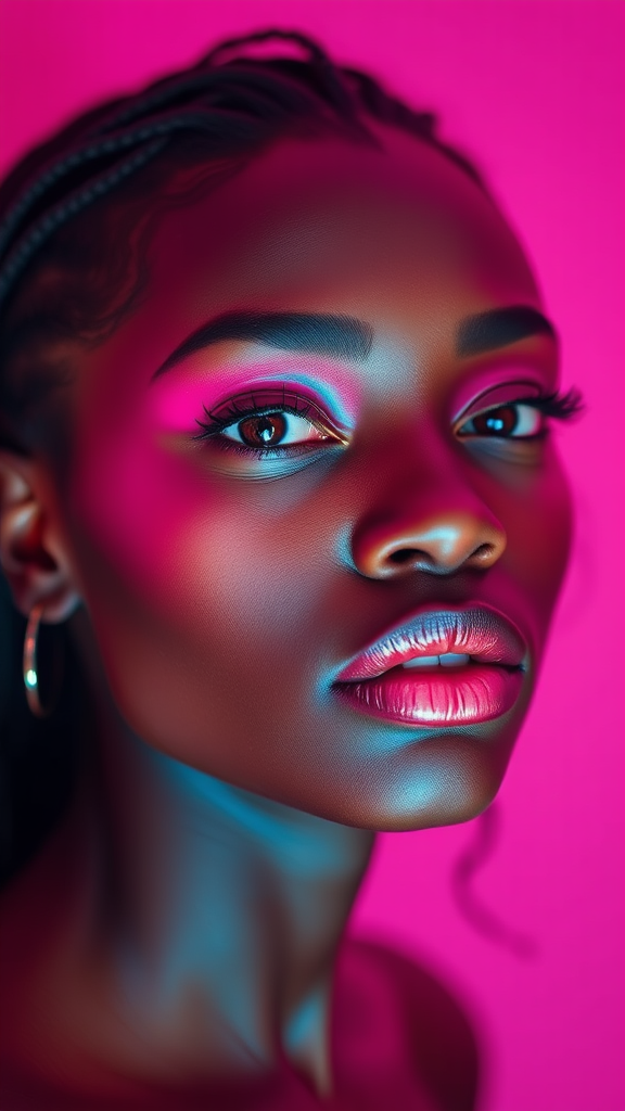 A striking portrait of a Black woman model, bathed in a luminous hot pink hue, set against a vivid solid pink backdrop. Her eyes are styled with intricate details, capturing a sense of depth and allure. The image employs a camera setup reminiscent of a large aperture, at an equivalent of f/1.4, creating a beautifully blurred background that highlights her elegant features. The composition embraces a raw and authentic style, infusing the scene with an ethereal and captivating essence.