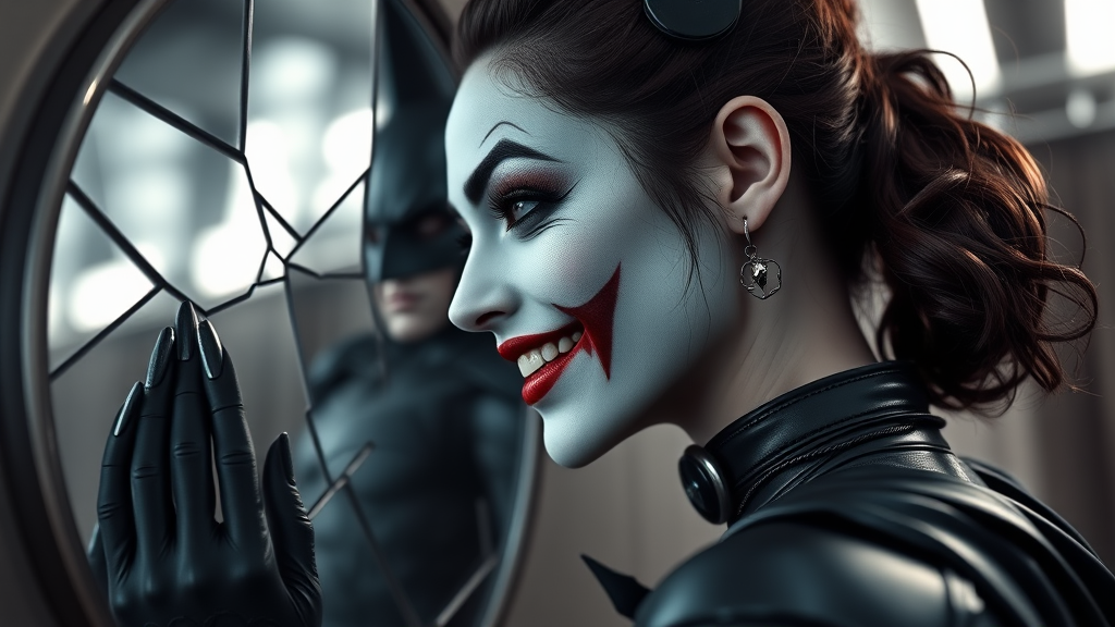 A striking portrait of a captivating young woman embodying the chaotic essence of the Joker, styled with the dark, intricate nuances reminiscent of Christopher Nolan's vision. She is adorned in a sleek, modernized Batman costume tailored for women, exuding an aura of gothic allure. Her face is split by an unsettling yet mesmerizing grin as she gazes into a broken mirror, fragments reflecting an atmosphere charged with horror and dread. The composition reveals her elegant silhouette, set against a backdrop that melds realism with a cyberpunk aesthetic. The image is meticulously crafted with high attention to detail, capturing the essence of both fashion-forward trends and timeless allure. Enhanced by advanced 3D techniques, octane rendering, and ray tracing, the visual narrative is intensified by dynamic, animated lighting and intricate textures that bring to life the pearl-like illusion of her skin, bathing her in an otherworldly glow. The overall depiction is a harmony of visual realism and fantasy, rendered in HD with an exquisite depth of field.