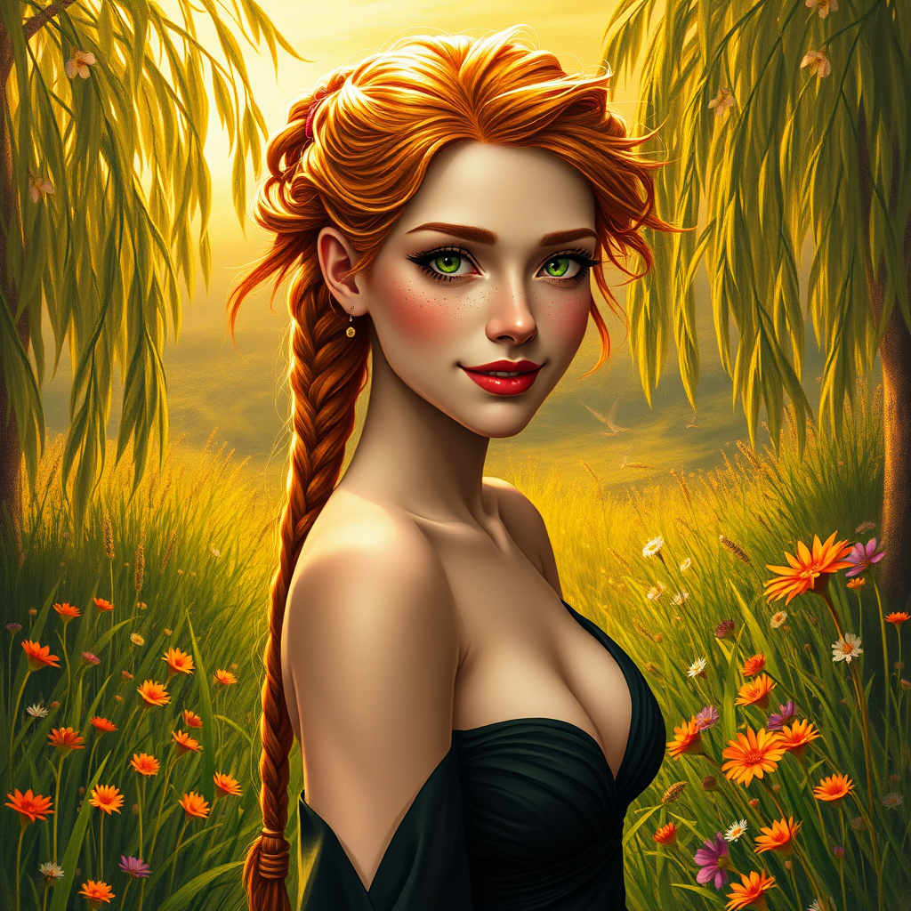 A striking portrait of a character with a detailed face, adorned with sensual, messy ginger hair and freckles. Strong features define a square jaw, accompanied by long intricate braids, high cheekbones, and sharp features. Heart-shaped lips frame a captivating smile, complemented by green eyes. The character is draped in a long, dark, elegant, sensual dress, emphasizing an hourglass figure with a large chest. The scene is set in dynamic golden hour lighting, enhancing the beauty of a colorful landscape filled with weeping willows, green grass, and vibrant flowers—emulating a fantasy earth art setting. The backdrop is a matte, detailed painting, intricate and elegant, echoing the styles of artgerm, greg rutkowski, alphonse mucha, and william-adolphe bouguereau. The painting embodies hyper-realism with smooth, sharp focus, showcasing the character in a full-body view. The environment is alive with reflections and rendered in high-quality octane, creating an 8K, photo-realistic masterpiece reminiscent of a lord of the rings bandit.