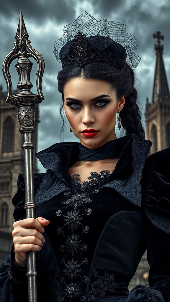 A striking portrait of a formidable woman, her gaze steady and piercing, her eyes a deep, captivating black, clad in an exquisitely structured, Gothic-inspired gown with lush velvet and delicate lace embellishments. The dress features angular designs, ornate metal clasps, and swirling layers of midnight fabric. Atop her head sits an elegant, high-crowned hat adorned with intricate veiling, while her raven hair is pulled back into a sleek, tight braid. In her hand, she grips a long, gleaming silver staff, her demeanor both stern and authoritative. The backdrop is a turbulent, stormy sky and towering, Gothic spires, amplifying the portrait's dramatic and commanding atmosphere.