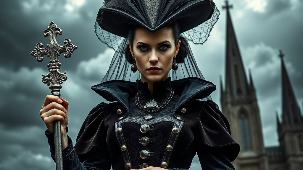 A striking portrait of a formidable woman, her gaze steady and piercing, her eyes deep and intense, stands in a Gothic-inspired gown adorned with rich velvet and delicate lace. The gown boasts bold, angular lines, intricate metallic fastenings, and cascading layers of ebony fabric. She dons a towering, pointed hat with elaborate veiling, as her dark locks are styled into a severe, sleek bun. In her grasp is an ornate, silver scepter, her expression exuding power and gravity. Behind her looms a turbulent, storm-laden sky and majestic, gothic spires, amplifying the dramatic and commanding aura of the scene.