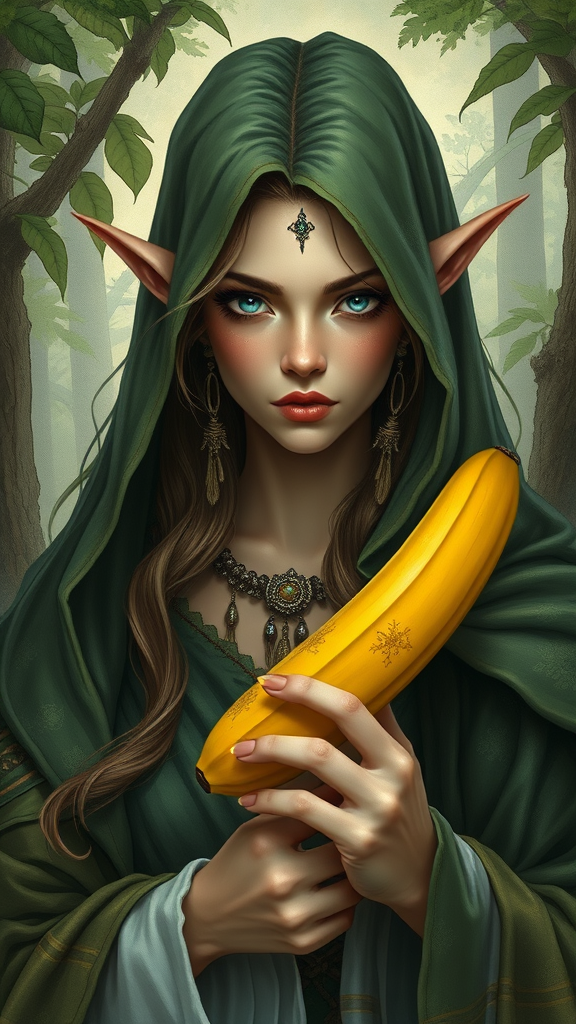 A striking portrait of a half-elf sorceress, holding a banana with an air of mystical authority. Her visage is a blend of human grace and elven elegance, embodying the essence of a forest mage. Her robes flow like the leaves of an ancient wood, intricately detailed, mirroring the epic fantasy art style. Her eyes hold the wisdom of a druid, and she seems to be a revered elfic priestess, resonating with the symphony of the wild. Her symmetrical features and enigmatic expression draw inspiration from the detailed, vivid craftmanship of Magali Villeneuve and the ethereal touch of Leona Wood, creating a compelling fantasy RPG character.