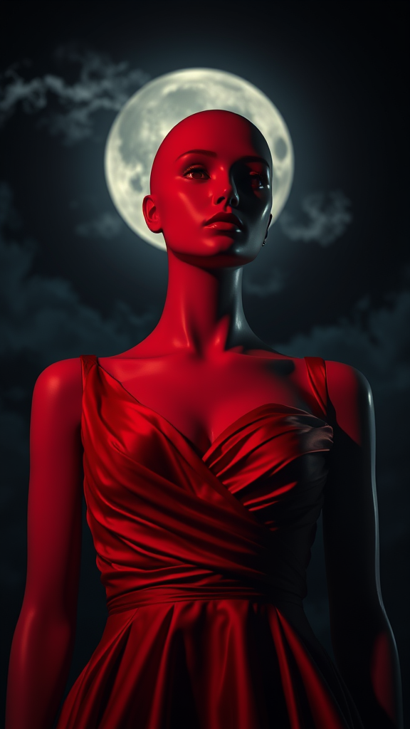 A striking portrait of a lifelike mannequin dressed in a crimson gown, set against the backdrop of a luminous full moon illuminating a dark, mysterious night. The scene is captured in hyper-detailed, ultra-realistic 8k resolution, with subtle glimmers of moonlight reflecting off the fabric, adding depth and texture to the vibrant dress. Shadows create an intriguing play of light across the mannequin's smooth features, enhancing its enigmatic allure. Elegant wisps of cloud drift across the sky, adding to the ethereal atmosphere of this captivating night-time tableau.