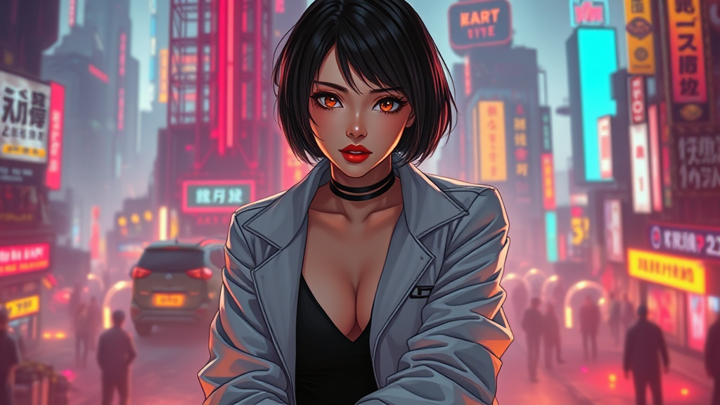 A striking portrait of a lone woman sitting amidst a cyberpunk landscape, capturing the essence of official art style in a unity 8k wallpaper. The ultra-detailed scene showcases her glowing skin amidst the most beautiful form of chaos, blending elegance with brutalist design. Dressed in a black bodysuit and white jacket, her short hair frames her face adorned with striking red lips. The vivid colours enhance the romanticism of the scene, with a detailed background depicting the eclectic energy of a futuristic cityscape. The wide shot places her far from the lens, adding a sense of depth and intrigue, as the anime-inspired aesthetic harmonizes with the core Cyberpunk 2077 theme.