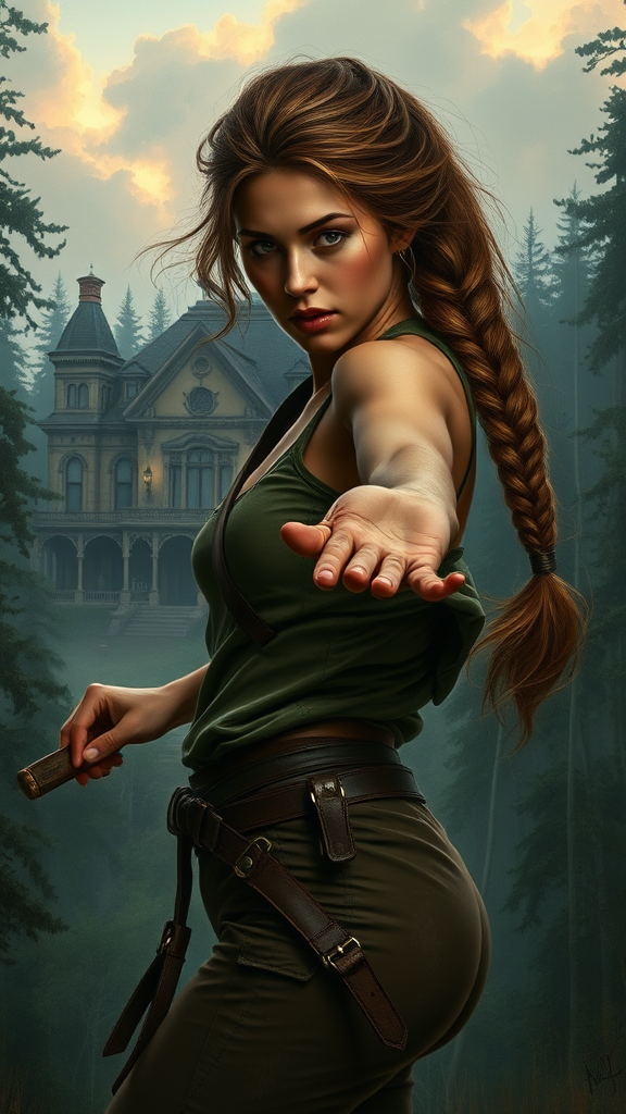 A striking portrait of a Lumberjack woman with a magnificent, flowing braid, dressed in a form-fitting outfit, captured in a dynamic action pose. The scene is rendered in rich oil paint, evoking an ancient, timeless quality, with a soft twilight glow illuminating her figure. In the background stands a grand, weathered mansion surrounded by an ancient, expansive forest. The mood is mysterious and captivating, a brilliant fusion of artistry inspired by Allan Jabbar, Yann Dalon, Toni Infante, and Amr Elshamy, with subtle, imaginative changes adding depth and intrigue.