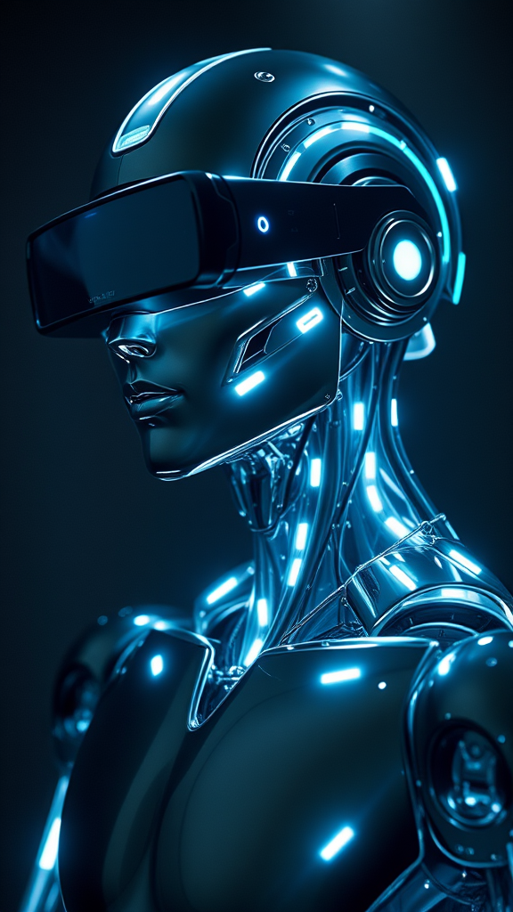 A striking portrait of a luminescent male cyborg with sleek chrome plating, featuring advanced VR goggles seamlessly integrated where eyes would be, set against a shadowy backdrop. The robot appears to be gracefully suspended in mid-air, exuding an aura of futuristic sophistication and mystique.