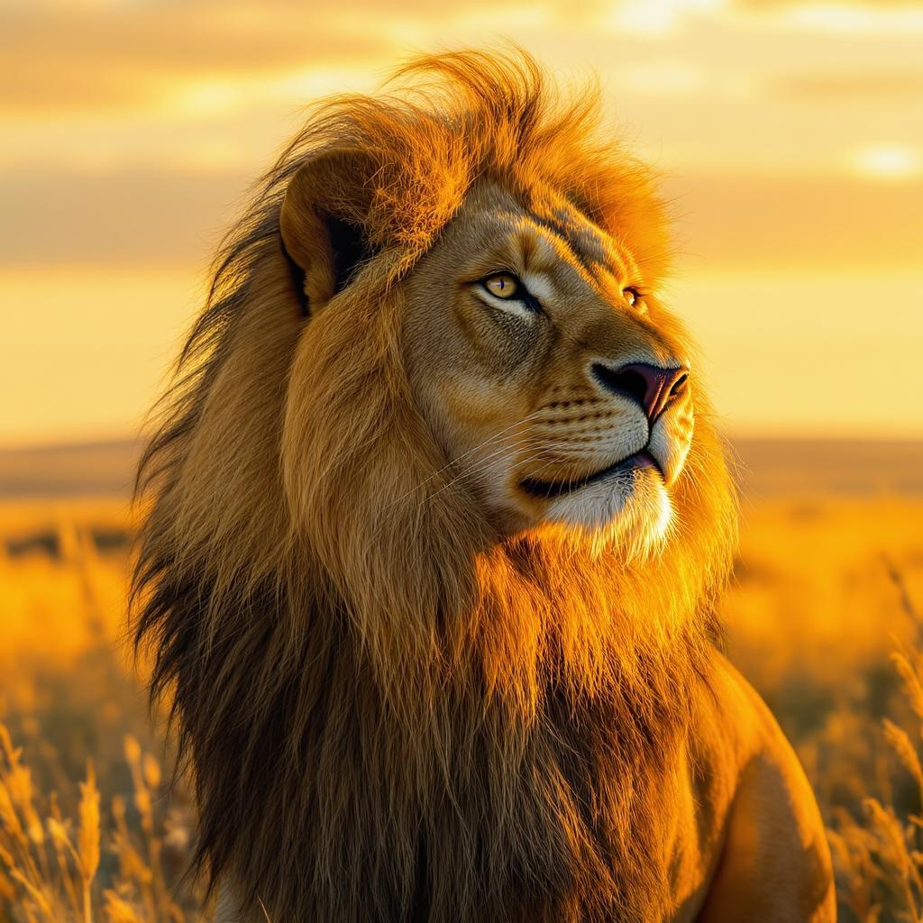 A striking portrait of a male lion poised with confidence in the shimmering golden light of the African savannah. This majestic predator embodies strength and power, his intense yellow eyes gazing resolutely into the horizon. His magnificent mane encircles his face, its rich, tawny shades illuminated by the light, forming a radiant halo. The lion's muscular physique is charged with energy, and his sleek fur reflects the warm, glowing light of the setting sun. Captured with a Canon EOS-1D X Mark II DSLR camera equipped with a 300mm f/2.8L IS II USM lens, the photograph boasts a 20.2-megapixel resolution and an ISO sensitivity of 800, allowing for exquisite detail of the lion's features. The camera was set to aperture priority mode at f/2.8, creating a shallow depth of field with a captivating bokeh effect in the backdrop. A shutter speed of 1/1000 sec was used to capture the lion's movement crisply. A circular polarizing filter reduced glare and enriched the colors of the sky and landscape. The lion’s powerful stance combined with the dramatic lighting heightens the image’s sense of presence and intensity, making it a stunning visual statement. Meticulous post-processing in Adobe Lightroom and Photoshop focused on color grading and contrast refinement, accentuating the lion's natural splendor to produce a hyper-realistic, breathtaking image. This timeless portrait encapsulates the spirit of the African savannah and its formidable predator in UHD, Super-Resolution, DTM, HDR, 8K.