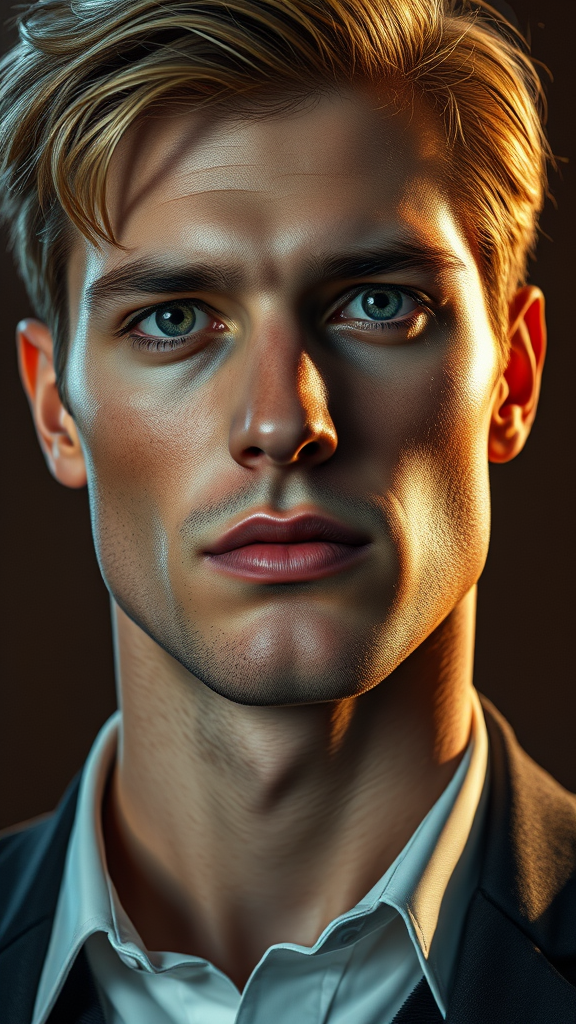 A striking portrait of a man with dark blond hair and a prominent nose, his expression serious and contemplative. The clean-shaven face reveals intricate details, capturing the essence of his character. Clad in elegant attire, the portrait frames his upper body, focusing on head and shoulders. The artwork, inspired by dmc_kay and WLOP, features dynamic and volumetric lighting that casts captivating shadows, enhancing the hyperdetailed render of the figure. The use of triadic colors adds depth and harmony, while the intricately detailed background and Splash effects create a sense of movement and energy, making the portrait both modern and timeless in its appeal.