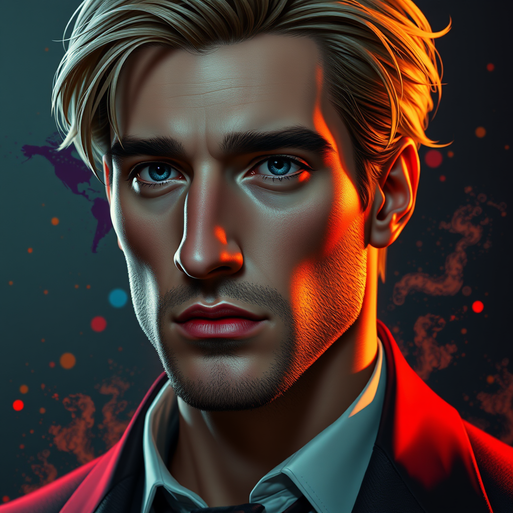 A striking portrait of a man with dark blond hair and a prominent nose, clean-shaven, showcasing a serious expression. Capturing his face details with dynamic lighting and a head and shoulders composition, he is dressed in elegantly styled attire. Rendered in 8k resolution, the concept art is intricately detailed, combining the artistic influences of dmc_kay and WLOP. The scene is set with hyperdetailed elements, featuring a vibrant splash of triadic colors and enhanced with volumetric lighting, emphasizing the depth and character of the subject.