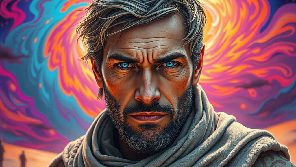 A striking portrait of a rugged male Dune character captured in a kaleidoscope of vibrant, psychedelic hues. His steely blue eyes radiate intensity, set against weathered skin and an expression of unwavering resolve. Clad in time-worn desert garb, his attire flutters subtly as if touched by the unseen whims of the desert wind. Behind him, an otherworldly sky swirls in a vivid, fantastical dance of color, transcending reality. Every detail is carefully considered: intricate patterns interlace his garments, glistening sand dusts his skin, and his eyes reflect minute, captivating textures. This scene is imbued with a serene yet potent energy, evoking the enigmatic spirit of the Dune universe and echoing the character’s silent strength and past battles. The painting takes inspiration from Conrad Roset’s vibrant tones and flowing forms, Greg Rutkowski’s exquisite lighting and detail, and Makoto Shinkai’s grand sense of scale and cinematic drama. This unique style resonates with the essence of the Dune character, capturing their depth in a surreal yet breathtakingly beautiful manner.