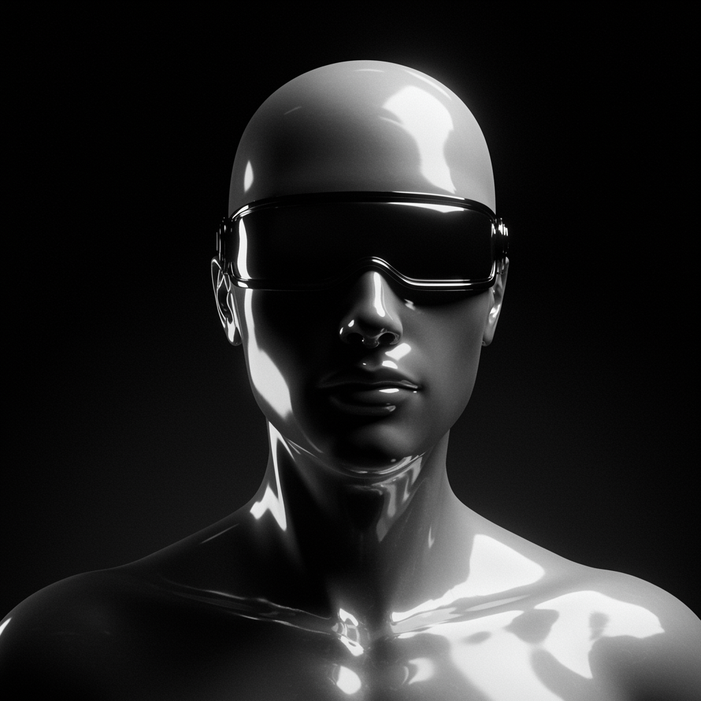 A striking portrait of a sleek, silver male cyborg with a futuristic visor replacing eyes, glinting brightly against a shadowy backdrop; the metallic surface reflects surrounding ambient lights as it appears to hover weightlessly in the darkness.