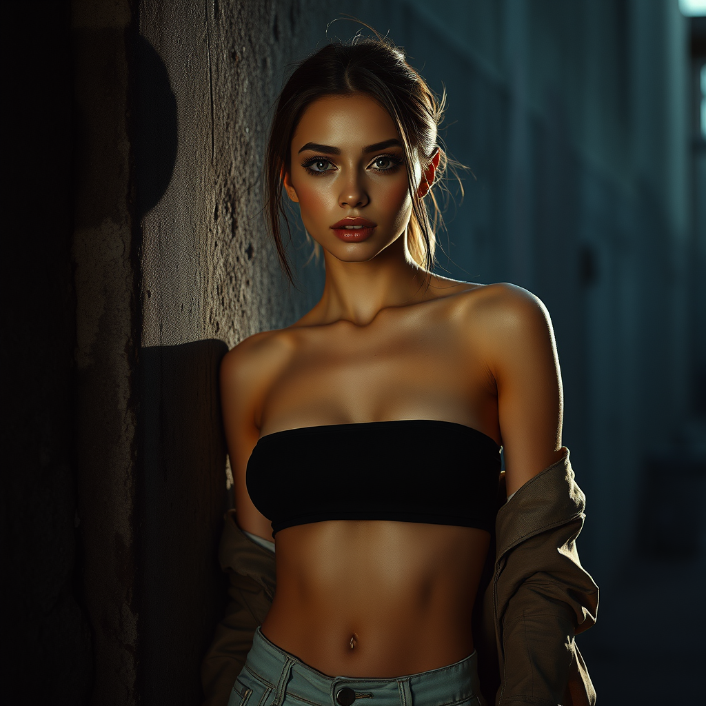 A striking portrait of a slender woman with a perfect, pretty face, adorned in a stylish outfit with a stomach cutout, leaning against a gritty urban wall. The moody evening light casts dramatic shadows, highlighting her hyper-realistic skin texture and delicate features. Captured in ultra-high resolution, the photograph showcases incredible detail, from her attire to the lifelike texture of her skin. Shot by Lee Jeffries using a Nikon D850 with Kodak Portra 400 film, the image boasts rich colors and a lifelike quality. Influenced by cinematic lighting, this piece is trending on ArtStation, reminiscent of a hyper-realistic scene from Unreal Engine.