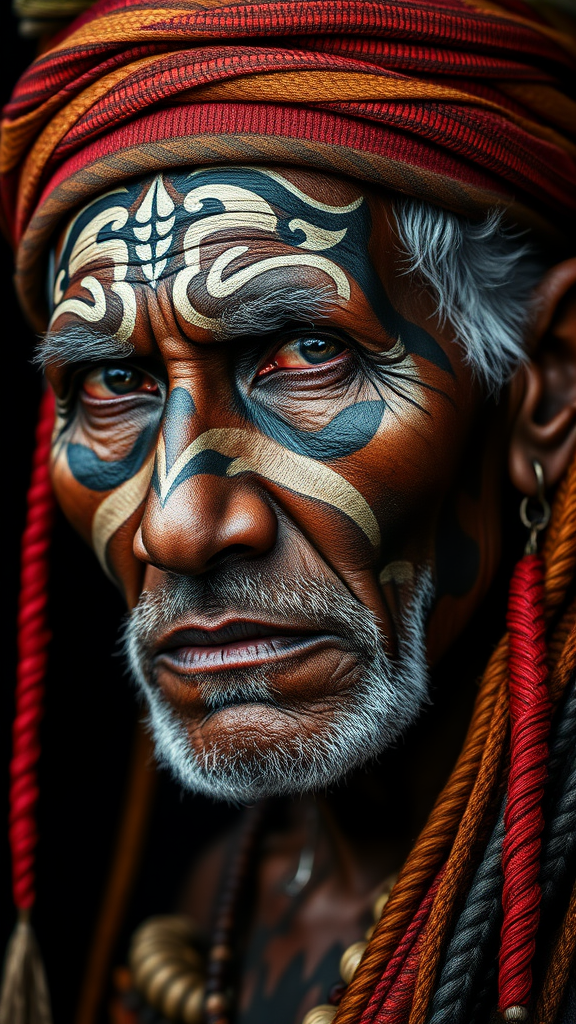 A striking portrait of a tribal elder graced with intricate face tattoos, captured in stunning detail with yang08k photography. Set against a deep black background, the image is both colorful and realistic, embodying the essence of masterpieces and top-quality art. The elder's visage conveys wisdom and beauty, enriching the overall aesthetics. This official artwork, resonating with authenticity and artistry, subtly integrates the essence of EasyNegativeV2 and ng_deepnegative_v1_75t techniques, while omitting collage, artist_name, signature, artist_logo, and watermark elements. The piece stands as a testament to traditional elegance in a modern photographic style.