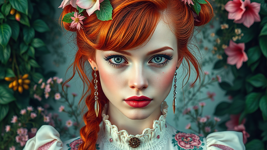 A striking portrait of a Victorian 80s punk woman with fiery red hair, adorned with a splash of vibrant pastel colors blending seamlessly into her attire, her expressive eyes reflecting a rebellious spirit. Her ensemble is complemented by an array of lush green plants and delicate flowers, interwoven into the background, adding an organic contrast to her edgy persona. Inspired by the detailed, ethereal style of Tom Bagshaw, this image captures a harmonious fusion of vintage elegance and modern punk flair, creating a whimsical yet bold visual narrative.