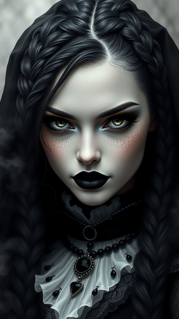 A striking portrait of a woman adorned in a black and white ensemble exuding a fashionable dark witch aura. Her gaze is intense and mysterious, capturing the essence of a gothic horror vibe. She features intricate braids interwoven with raven-black threads, highlighting her mystical allure. The digital artwork, reminiscent of the profound detail found in the styles of guweiz, loish, and WLOP, merges dark elegance with an air of enchantment. Her lips are painted a deep, velvety black, contrasting against her pale, porcelain skin. A faint, shadowy mist swirls around her, amplifying her dark witch charisma. She embodies the essence of a gothic girl, her eyes holding secrets from ancient realms, inviting and enigmatic.