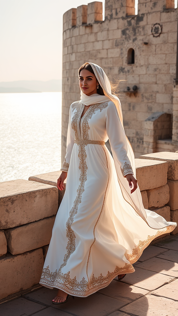 A striking portrait of a woman in a traditional Bahraini Thobe, set against the backdrop of the majestic Bahrain Fort. Her Thobe is a flowing, ivory gown adorned with intricate gold and silver embroidery, catching the light as she gracefully strides along the fort's ancient stone walls. Behind her, the vast expanse of the Arabian Gulf glistens under the sun. The scene beautifully juxtaposes the fort's storied past with the natural splendor of the sea, celebrating her timeless elegance and Bahrain's rich cultural heritage, while a gentle breeze adds movement to her attire, symbolizing the harmony between tradition and nature.