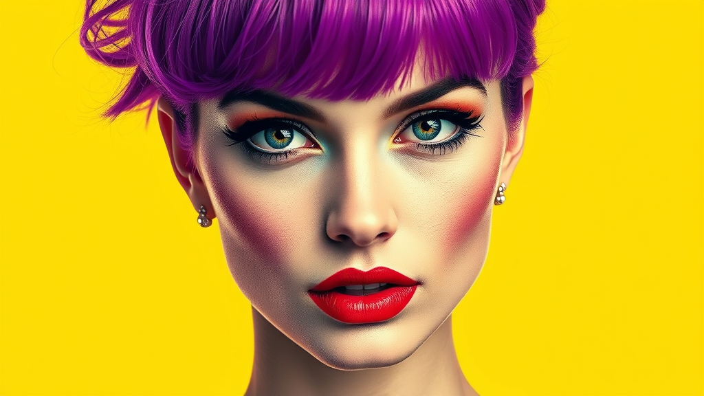 A striking portrait of a woman with electric purple hair, blending the pop art flair of Andy Warhol with Richard Avedon's high-contrast, minimalist photography. Her face is intricately detailed, highlighted by dramatic contrasts and a piercing gaze. The bright, contrasting background enhances the vivid colors, creating a dynamic interplay of bold lines and vibrant hues that captures both the iconic energy and contemporary essence of modern pop culture.