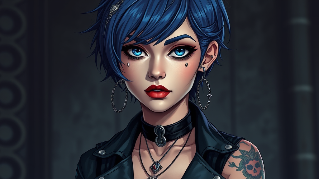 A striking portrait of a woman with tousled blue hair adorned with multiple piercings, set against a moody dark industrial backdrop. Inspired by the style of Charlie Bowater, the image captures a sharply focused, smooth aesthetic with exceptional detail. She has piercing blue eyes that shine with a realistic and vibrant texture, framed by a subtle yet captivating glow. Her face is intricately detailed, showcasing a blend of dark and elegant makeup. The character is adorned with a black choker, matching earrings, and various pieces of jewelry, accentuating her edgy style. Her short hair frames her face, while her attire comprises rock-inspired clothing featuring a sleek leather shirt that reveals a tattoo on her arm. Her elegant pose is highlighted with precise lighting, reminiscent of cinematic flair. The overall composition maintains a balance between a cartoon-inspired style and high realism, enhancing her distinctive presence within this meticulously detailed high-resolution image.