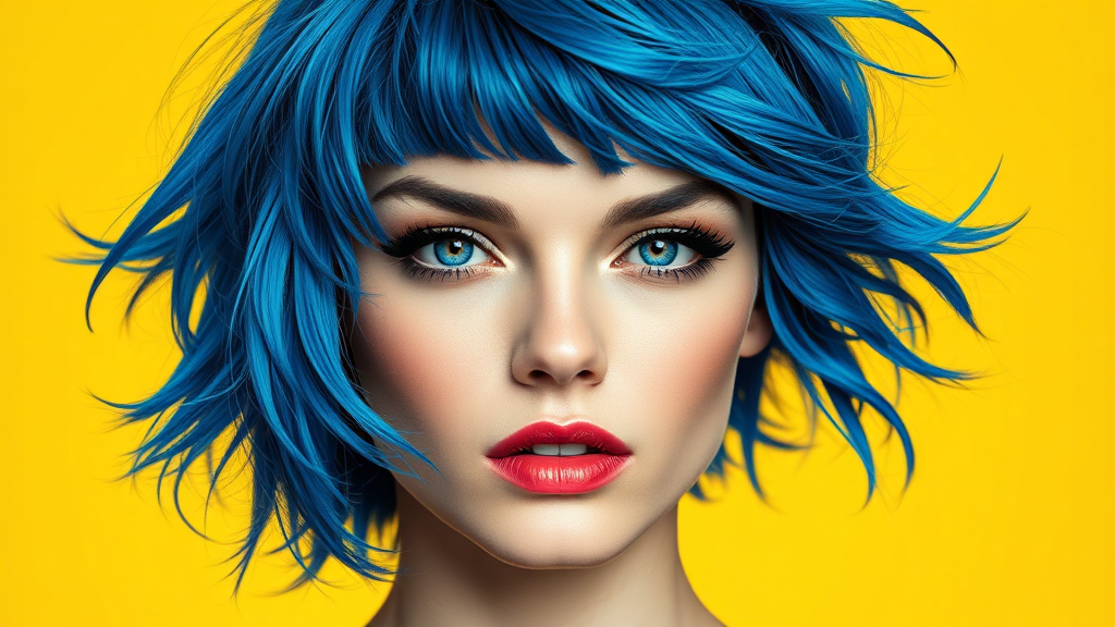 A striking portrait of a woman with vivid electric-blue hair, inspired by the styles of Andy Warhol and Richard Avedon, blending pop art's dynamic colors and graphic lines with a stark, high-contrast photographic approach. Her face is intricately detailed, with an intense, captivating gaze, set against a bold, contrasting yellow background, embodying the iconic and contemporary essence of modern pop culture.