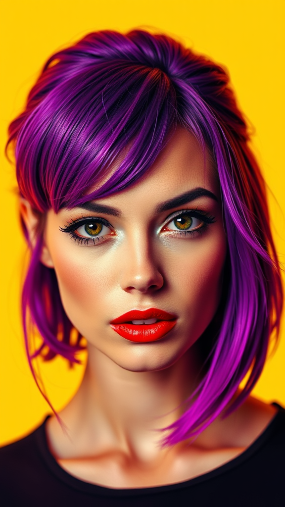 A striking portrait of a woman with vivid purple hair, blending the essence of Andy Warhol's pop art vibrancy and Richard Avedon's minimalist, high-contrast photography. Her face is sharply detailed with a captivating gaze, set against a bright, contrasting background. The portrait features bold colors and graphic lines, capturing the iconic and contemporary essence of modern pop culture with a touch of unique creativity.