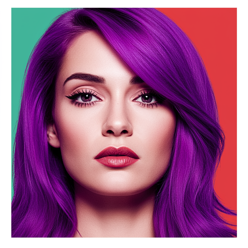 A striking portrait of a woman with vivid purple hair, blending the essence of Andy Warhol's pop art and Richard Avedon's minimalist photography. Her face is sharply detailed with a captivating gaze, framed by bold colors and graphic lines. Set against a vibrant, contrasting background, this composition captures the iconic essence of modern pop culture with its high-contrast and contemporary feel.