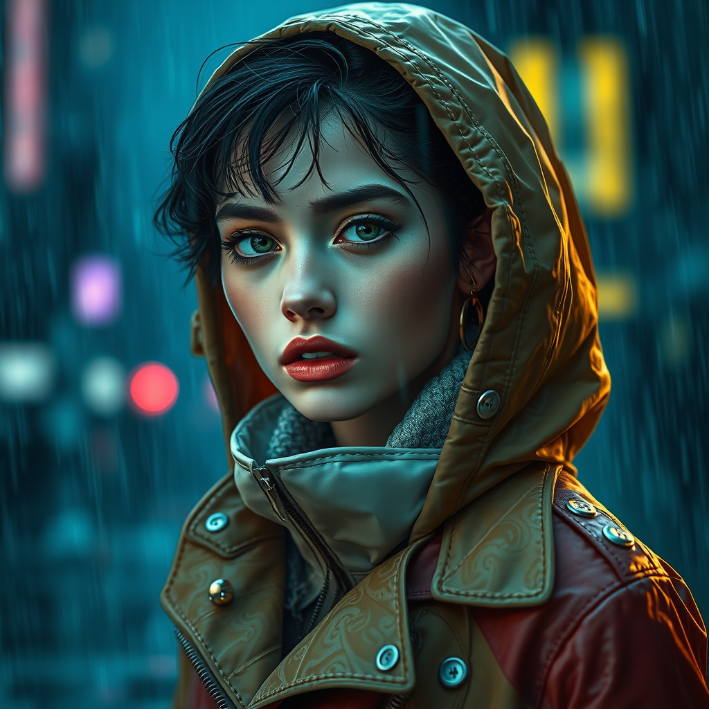 A striking portrait of a young European woman enveloped in a stormy rain setting, styled in a movie-inspired futuristic sci-fi jacket and royal coat. Her attire reflects a blend of Ismail Inceoglu and Dragan Bibin's imaginative designs with elements of Hans Thoma and Greg Rutkowski's artistry. The portrait is imbued with a sense of elegance influenced by Alexandros Pyromallis and Nekro, with a surreal twist reminiscent of Rene Magritte. Her features are impeccably crafted, with a perfect, finely detailed face and sharp chin. Aesthetic influences of cyberpunk, neo-Tokyo, and synthwave are evident, with gentle low-emission neon hues evoking a Blade Runner movie scene ambiance. The artwork captures a sense of futuristic allure, portrayed in high resolution with vivid realism.
