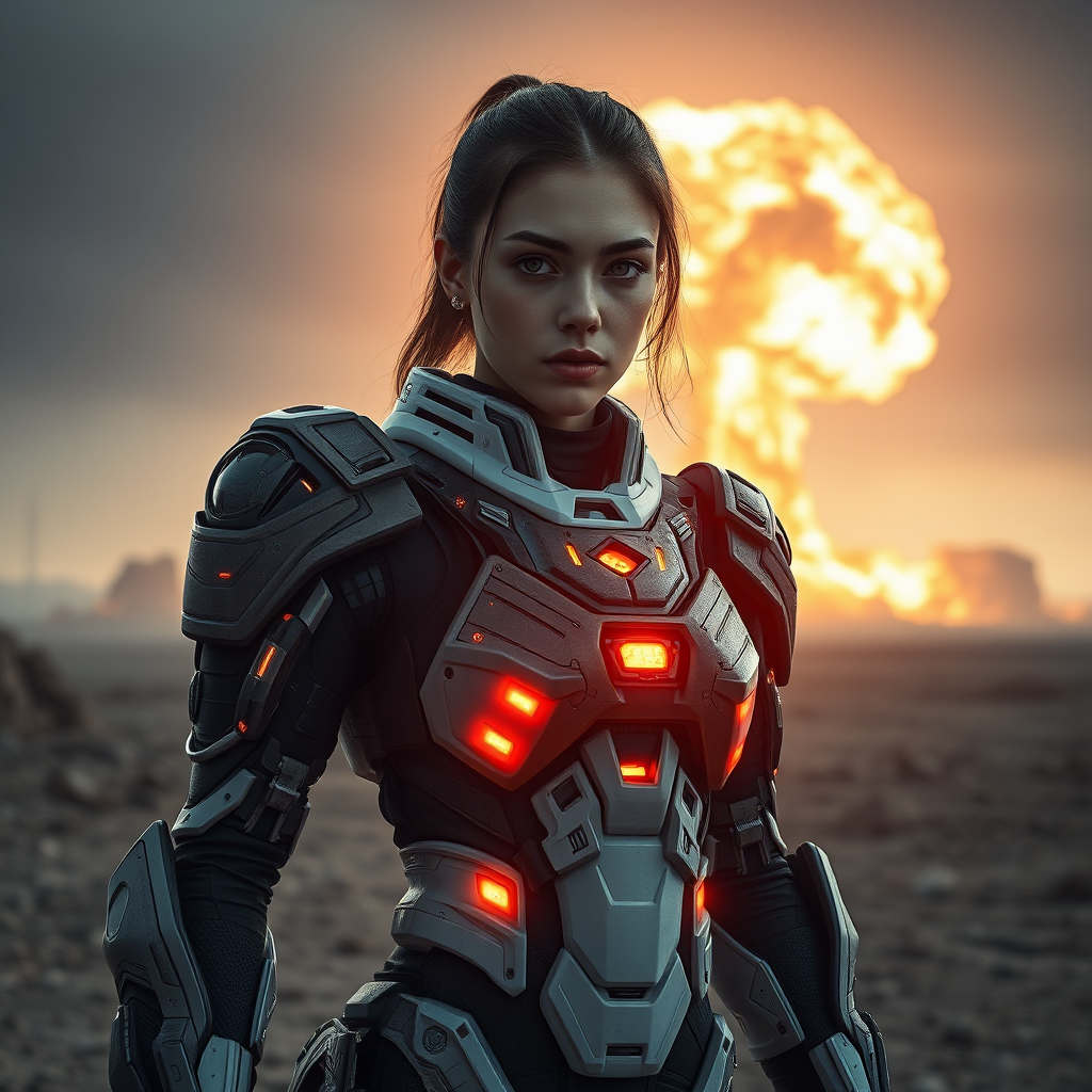 A striking portrait of a young woman in an intricately designed exo suit, featuring advanced sci-fi armor, set against the dramatic backdrop of a nuclear explosion in the distance. The composition captures the intense blast wave and swirling nuclear ash, emphasizing themes of atomic fission. The scene is rendered in exceptional detail, with a full-body shot that highlights her poised stance reminiscent of a movie still. Utilizing 8K UHD resolution, the image embodies cinematic and futuristic elements with photorealistic and hyper-realistic qualities. The portrayal captures a sense of acceleration and a brilliant flash of light, as if caught in a painting with a third-person perspective. The long exposure effect combines with complex lighting to create a dynamic and immersive scene, characterized by meticulous cinematic staging and vibrant, intricate details.
