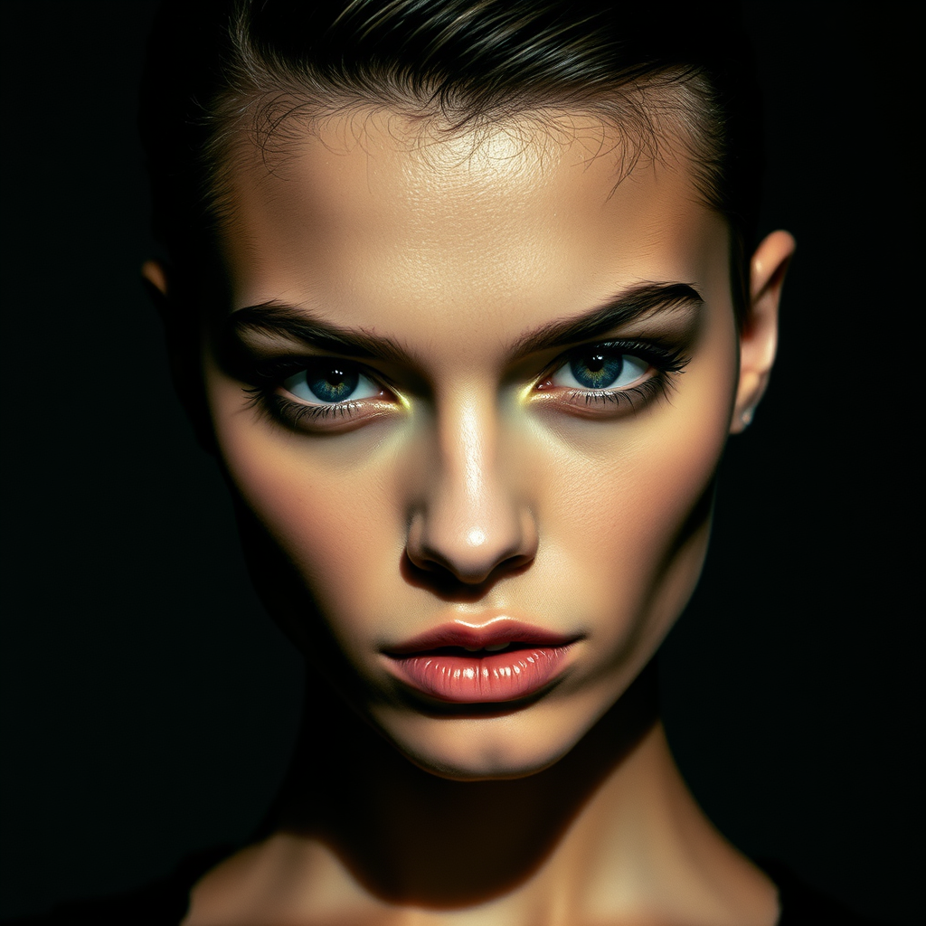 A striking portrait of a young woman with a sleek and modern hairstyle, and intense, captivating eyes. The image is captured in a high-contrast manner, with deep shadows and bright highlights accentuating the model's defined features. Photographed using a film camera and a fast prime lens, the picture has a textured and authentic vibe. Ideal for fashion editorials, marketing visuals, or as an eye-catching art print.